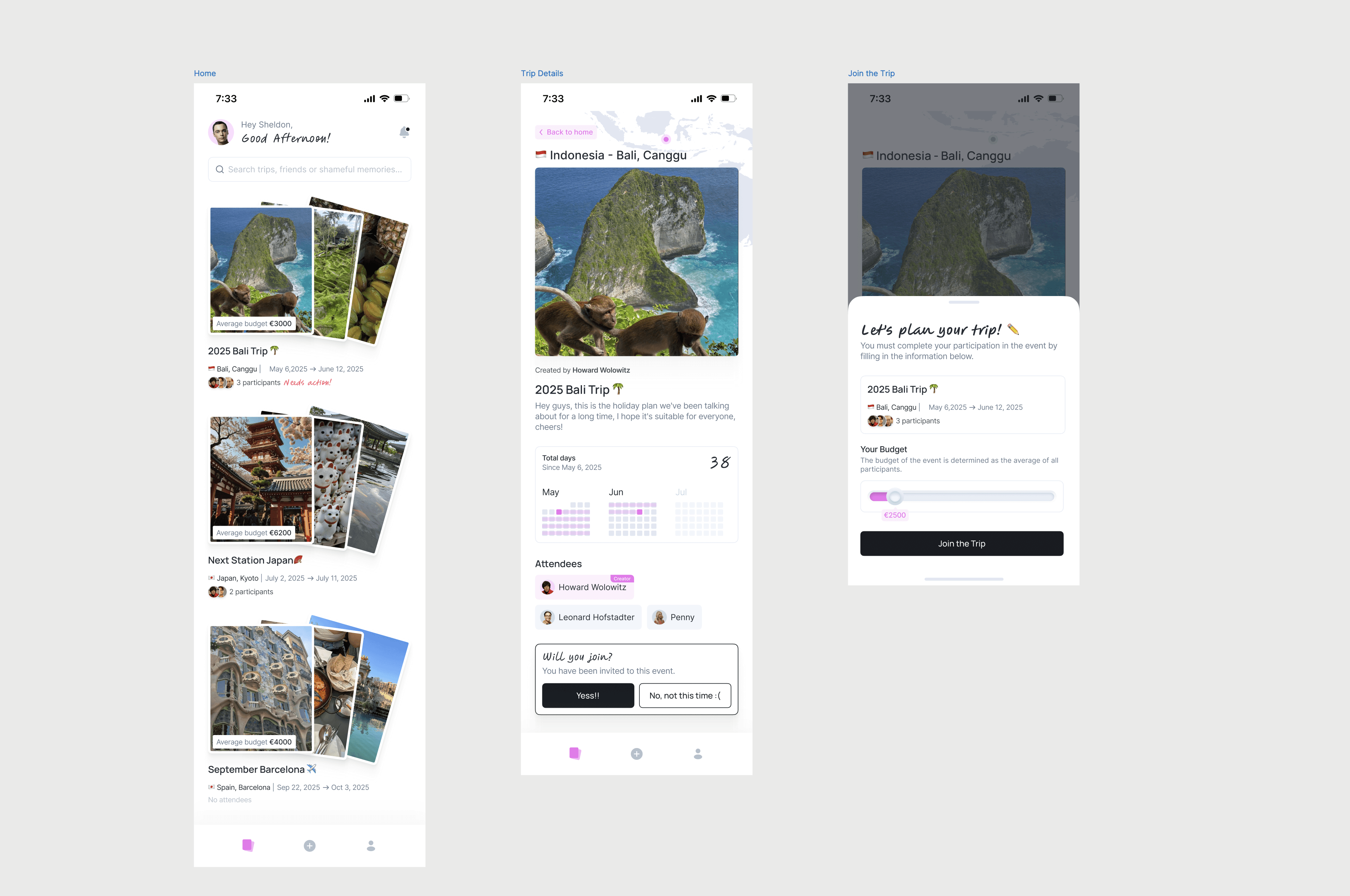 Count Me is a mobile app created to help users plan trips in a collaborative and organized way. The experience brings together destinations, dates, budgets, photos and group activities in a clear and social format. The goal of the product is to make trip planning easier by combining inspiration and structure in a single flow.