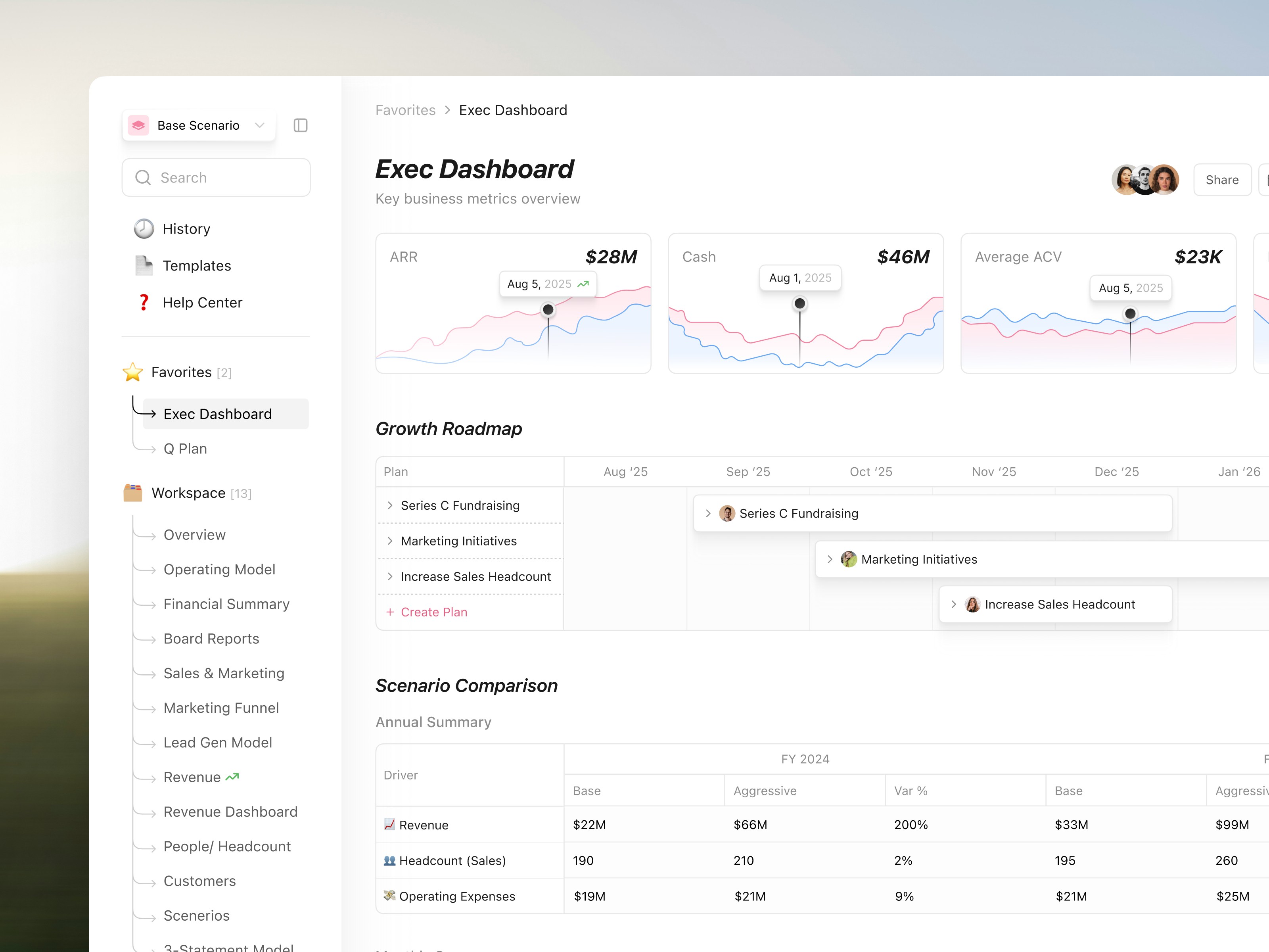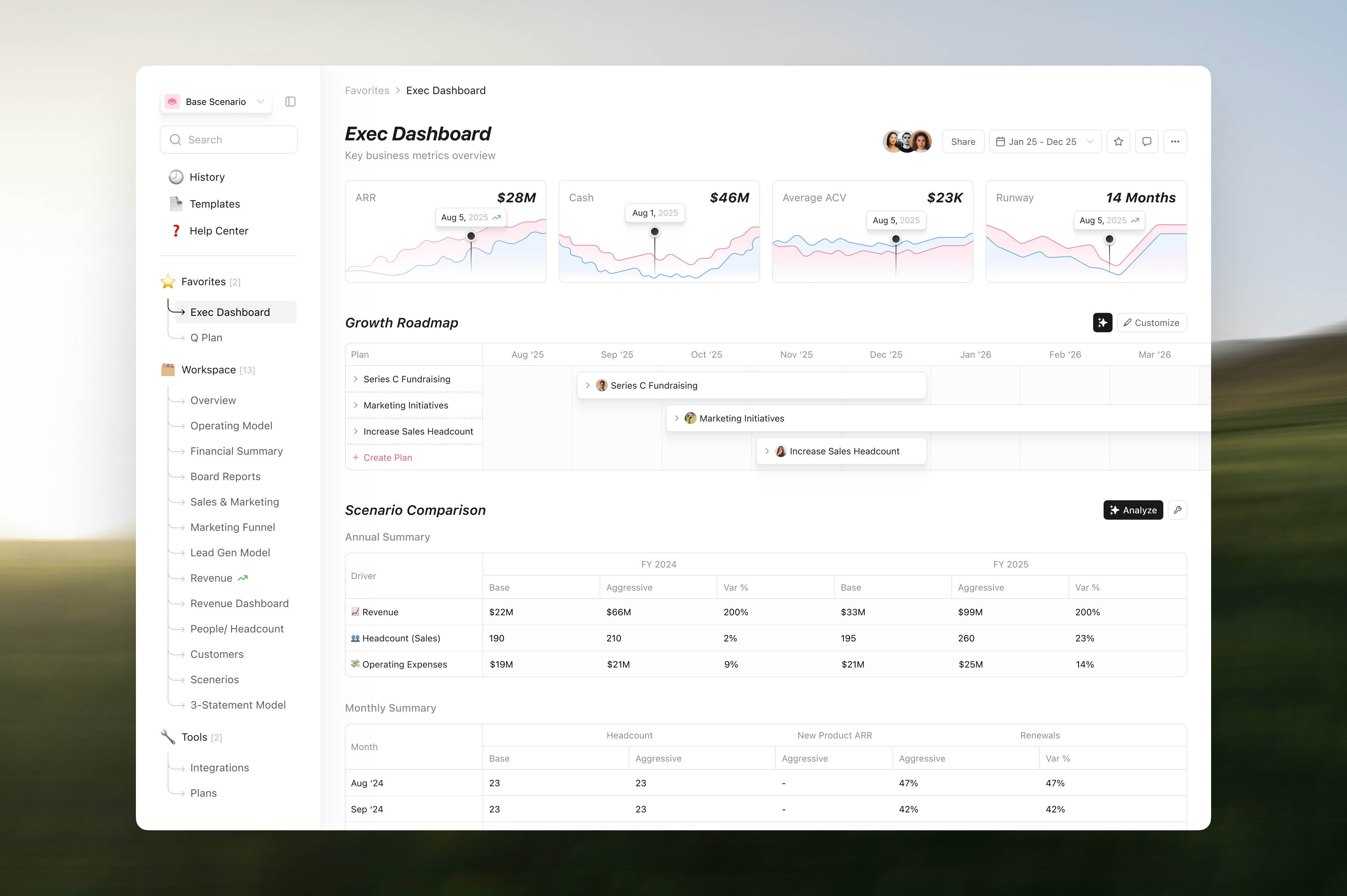 Runway is a modern FP&A (Financial Planning & Analysis) platform built to help fast-growing teams simulate business decisions, build flexible financial models and drive data-informed choices across finance, sales, marketing and operations.